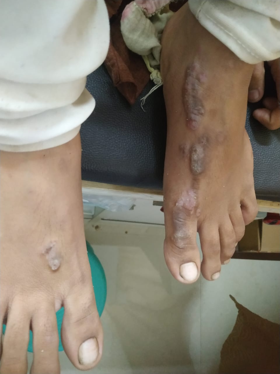 15yr female child having complaint of itching B/L pedal with nodular swelling like scar since 5 month.Please suggest 🙏🙏